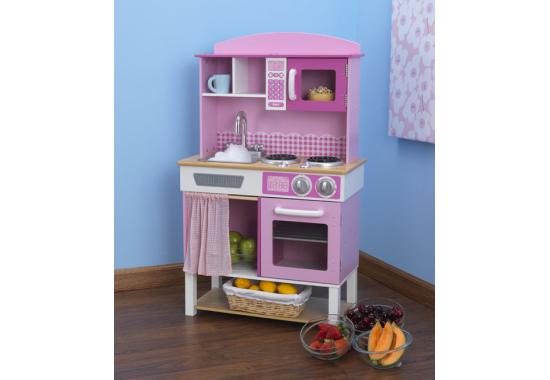 Кухня сделана из дерева и покрыта гипоаллергенной краской, так что безопасна для любого малыша и способна прослужить ему не один год. В зависимости от цвета детской ваш ребенок может выбрать розовую, белую или красную кухню.