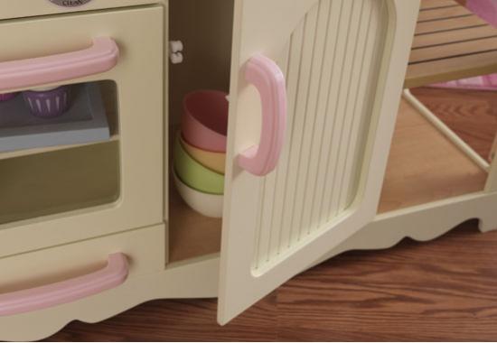За веселой игрой с друзьями ваша малышка будет усваивать навыки гигиены и безопасности на кухне, научится обращаться с кухонными приборами и может даже усвоить некоторые несложные рецепты с вашей помощью. Маленькой декоративной особенностью этой кухни является наличие доски для записок на двери морозильной камеры. На ней можно писать или рисовать обычными мелками.