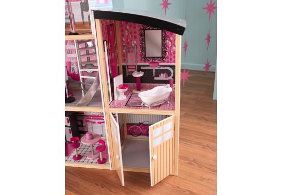 Изящный домик с выдающимся вперед балконом содержит все, что нужно для игры с Барби или с другими подобными куклами. На трех этажах располагается комфортабельный игрушечный особняк, в нем имеется ванная, удобная спальня, лифт, веранда и даже рояль, который может играть музыку. С внешней стороны домик разукрашен под мозаику и покрыт нежно-розовой крышей - сочетание этих цветов очень нравится девочкам, кукольное жилище будто только что сошло со страниц сказки. Комнаты удобно расположены, ко всем есть доступ с лицевой стороны дома, которая полностью открыта для более удобной игры. В доме имеются настоящие окна на верхнем этаже, винтовая лестница на третий этаж и даже люстра. Интерьер продуман до мелочей: вся необходимая кукольная мебель входит в комплект, однако в доме достаточно места, чтобы разместить еще и, возможно, имеющиеся у ребенка кукольные аксессуары для обустройства жилья. Торшер в спальне зажигается одним нажатием пальца, а в унитазе имитирован звук слива воды. Эти реалистичные мелочи позволят вашей малышке почувствовать, что в ее кукольном мире все по-настоящему и она сама - владелица шикарного замка.