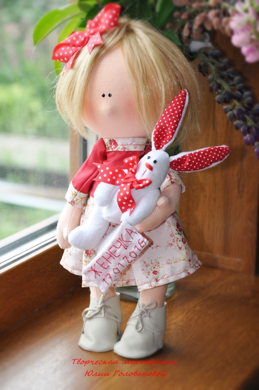 Сшита по образу маленькой девочки. Ростик 32 см. В ручке держит плюшевого зайку, в ручке у которого бирочка с именем и датой рождения.