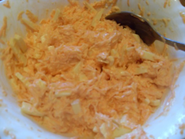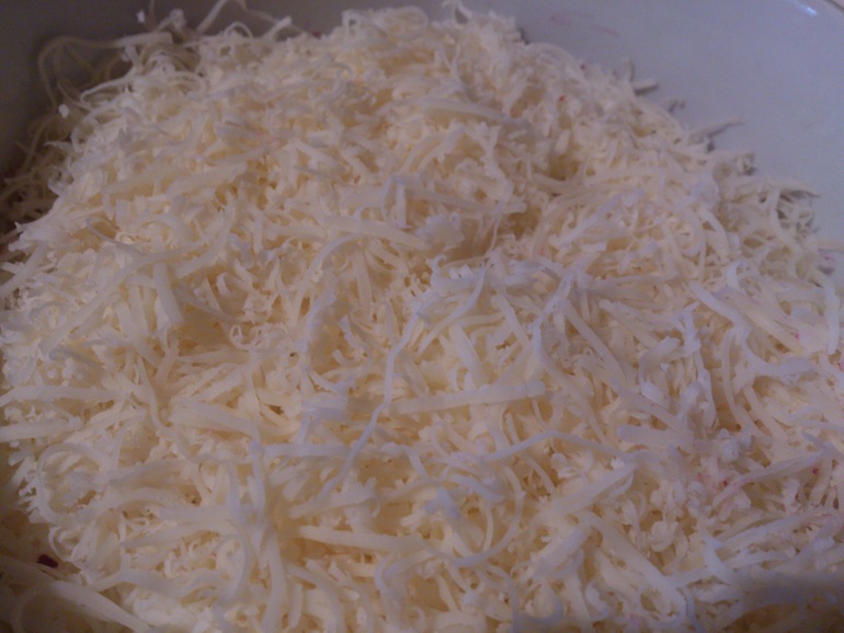 Выложить всю рыбу, затем оставшуюся свеклу, майонез и натертый сыр: