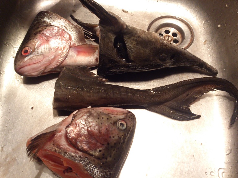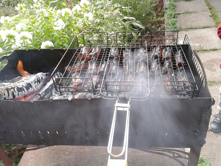 Запекали осетра на гриле. Головы осетра, форели, семги замораживали до времени и потом готовили уху: