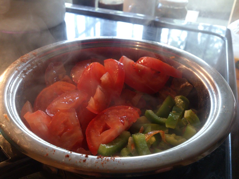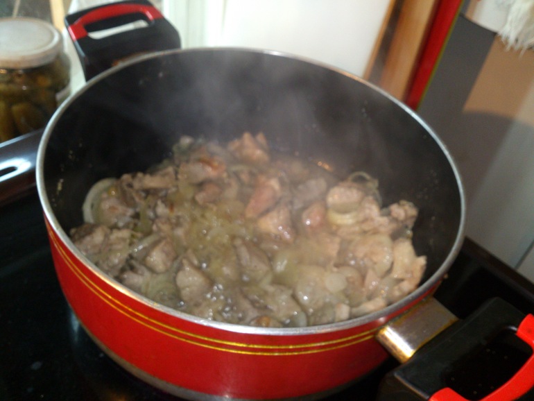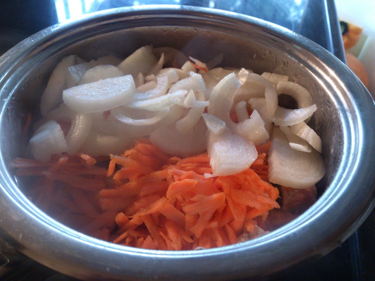 Мясо потушить 20 минут с добавлением воды. Затем всыпать лук и морковь: