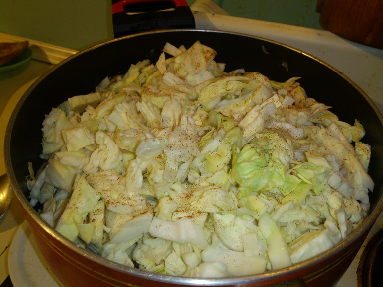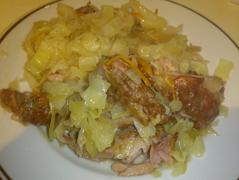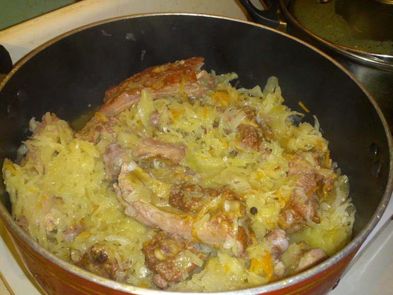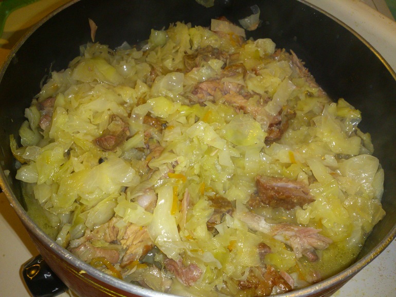 Потушить до полуготовности, добавив воды. Положить немного квашенной капусты и потушить: