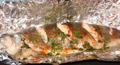 В мангале мы в фольге запекали форель с травами и лимоном: