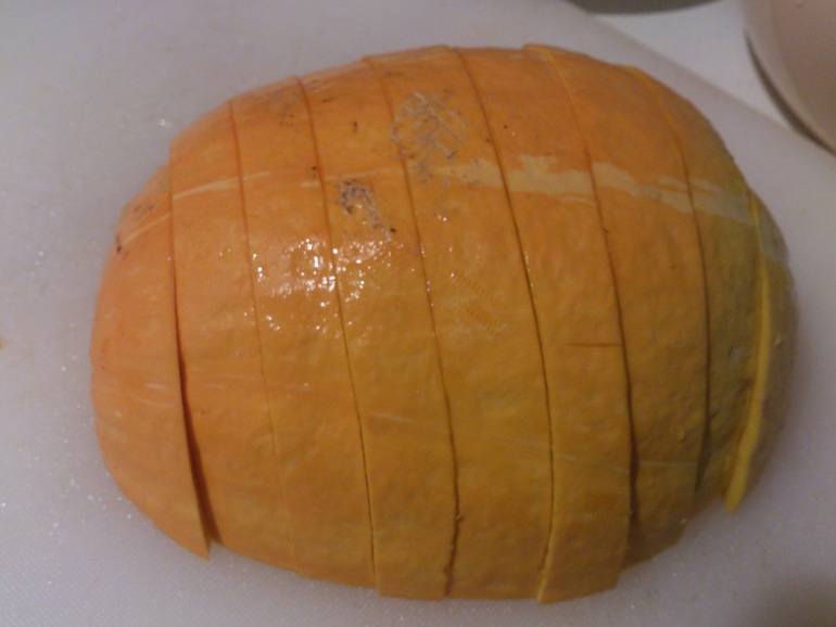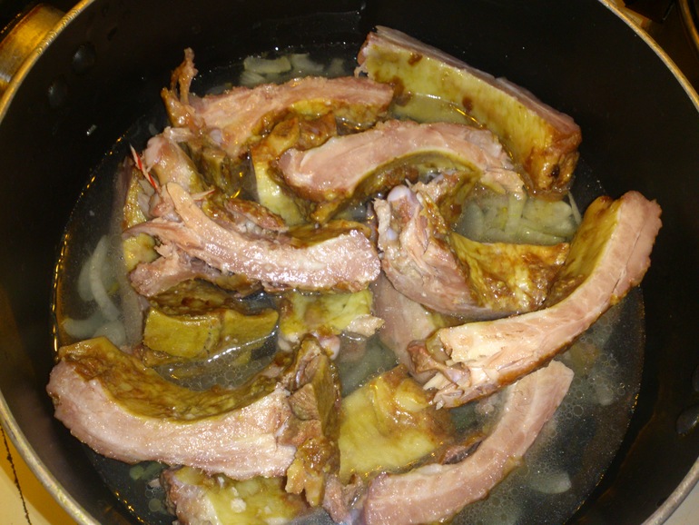 Замариновать в любимом маринаде (самое простое - лимонный сок с перцем и солью; у нас был готовый маринад):