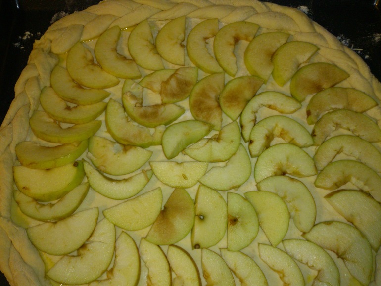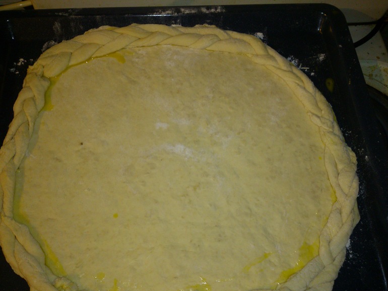 Подогретое молоко смешать с яйцами. Добавить дрожжи, соль, сахар, маргарин (я использую старую сметану). Всыпать посеянную муку и замесить гладкое тесто. Дать тесту подойти. Раскатать круг толщиной 0.7 см, разложить на противне. Сделать бортик (у меня косичка на смазанном желтком тесте):