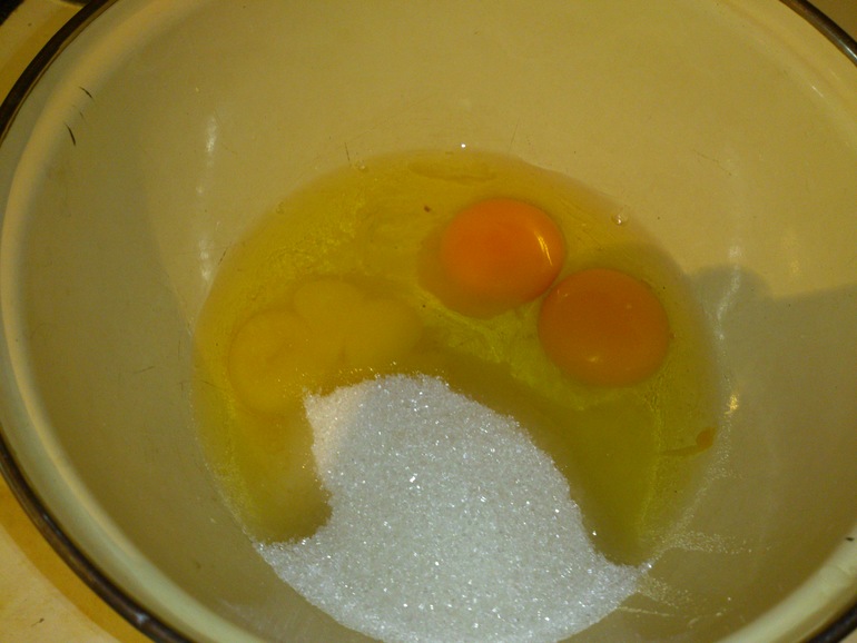 Смешать 3 яйца с половиной стакана сахара, щепоткой соли и ванилином
