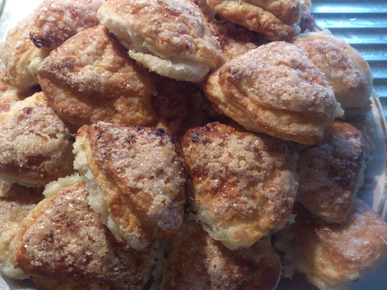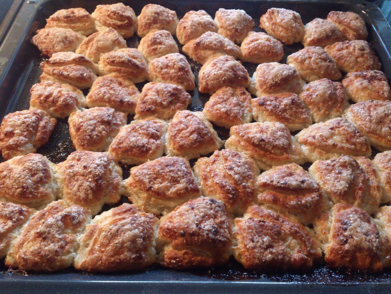 Обмакнуть кружок в песок, свернуть пополам и снова обмакнуть, затем еще раз свернуть и обмакнуть уже четвертинку. Выложить сахаром кверху. Выпекать при максимальной температуре: