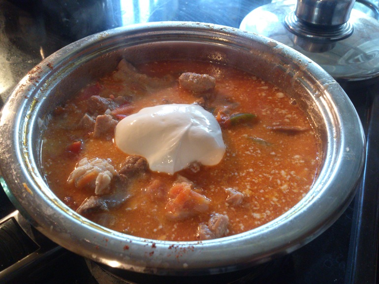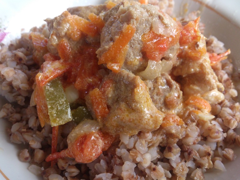 Тушить еще 5 минут. Мы любим гуляш с гречей, хотя хорош он с любым гарниром: