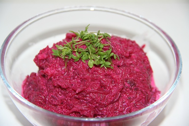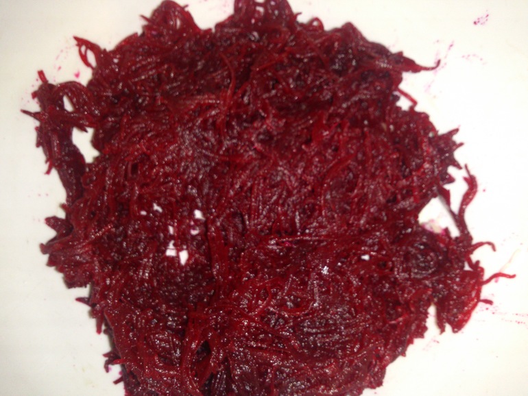 Овощи были в приоритете. От молодой свеклы все были в восторге. Придумался новый свекольный салат. Отварить свеклу, остудить, очистить, натереть:
