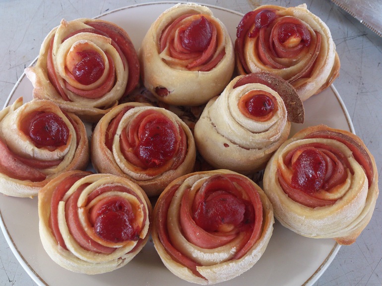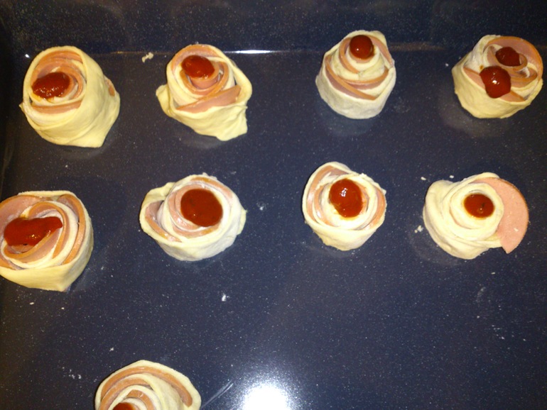 Еще мы "утилизировали" колбасу, делая розы. Для этого надо просто раскатать тонко любое тесто (дрожжевое, вытяжное, слоеное - у меня дрожжевое из сыворотки, яиц, маргарина, дрожжей и муки). Нарезать полосками. Смазать кетчупом, разложить половинки кружков колбасы. Скатать рулетиком, поставить вертикально на противень. Можно капнуть кетчупом: