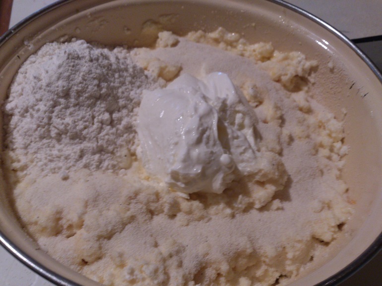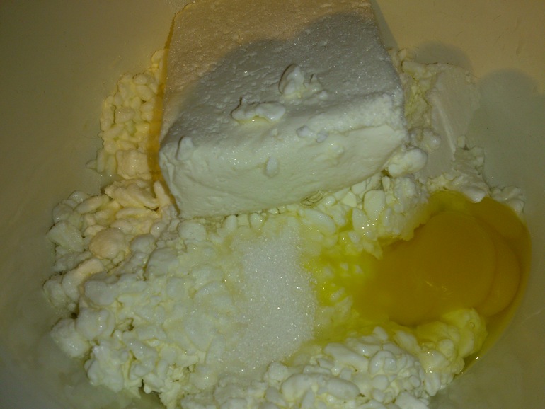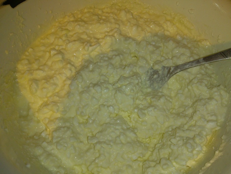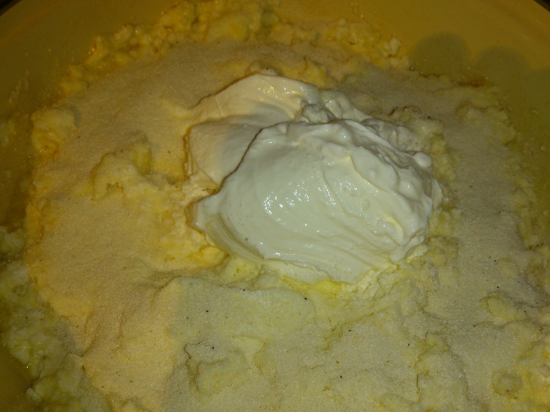 Смешать 1 яйцо, 50 г сахара, ванилин и 400 г творога: