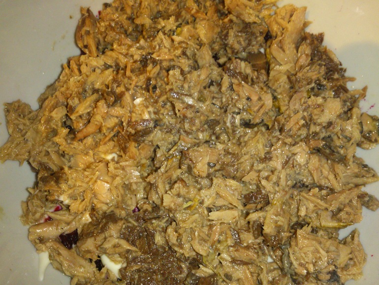 Рыбные консервы (у меня тунец в собственном соку) размять прямо в банке: