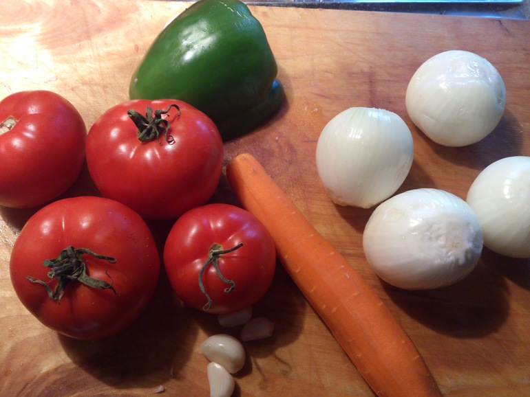 Приготовить овощи с грядки - лук, морковь, чеснок, перец, помидоры: