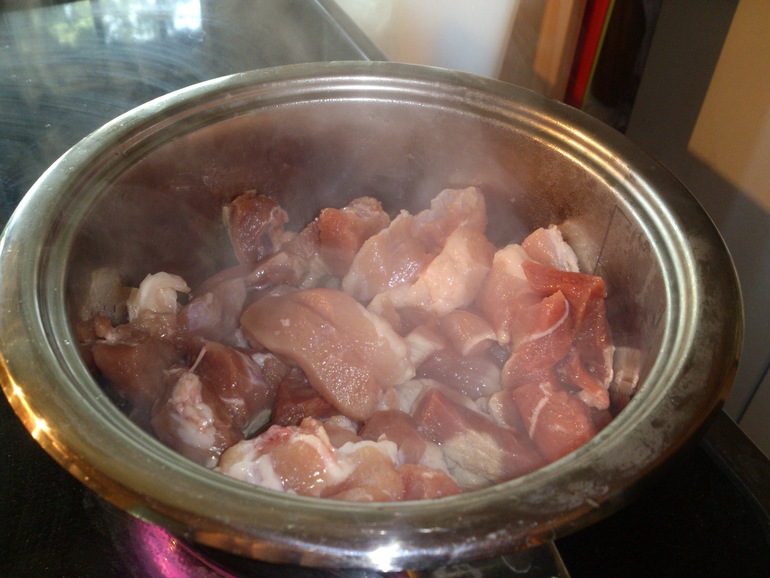 Овощей на грядках много. Потушила и овощное рагу со свининой. Свинину нарезать на кусочки, обжарить в сотейнике с луком: