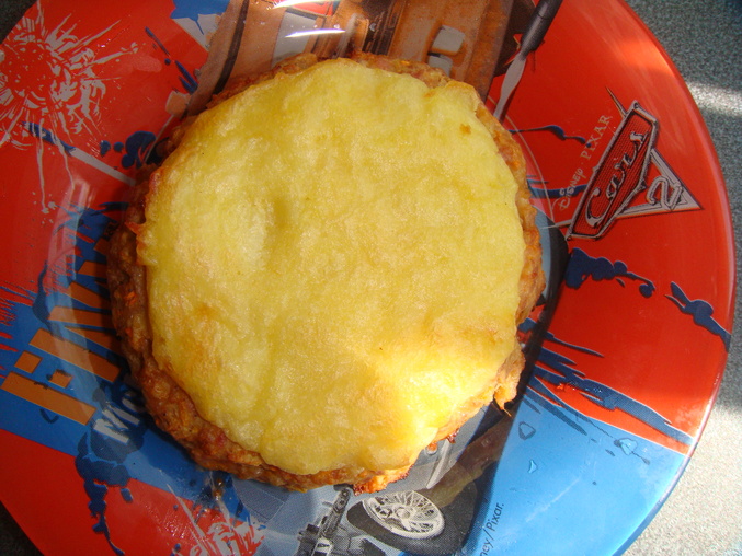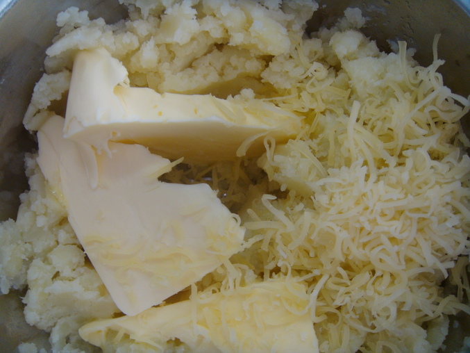 Сварить картошку, слить, размять, добавить сливочное масло и натертый сыр:
