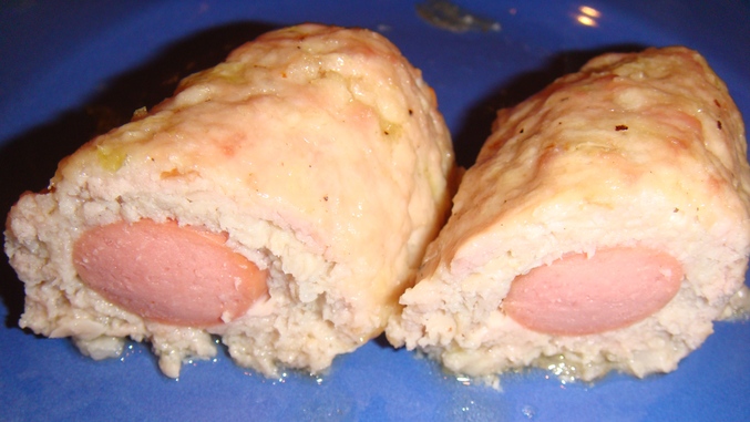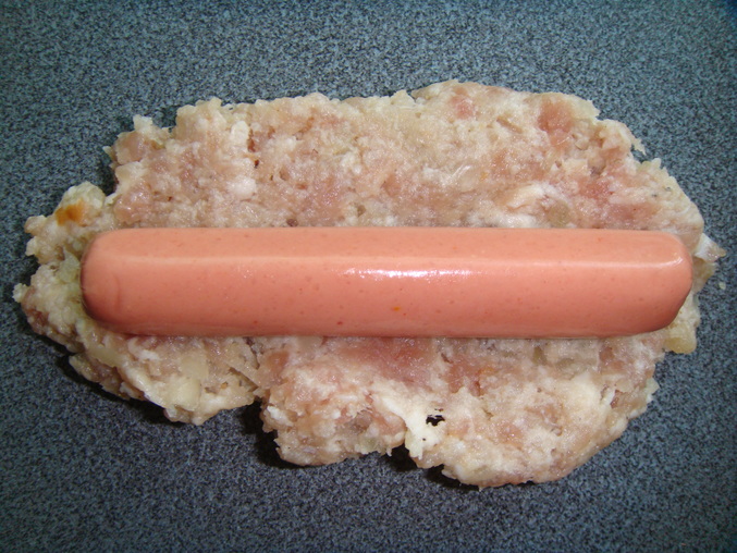 Положить лепешку фарша на руку, сверху сосиску и аккуратно завернуть: