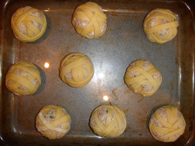Намотать полоски произвольно на шарики мяса и разложить на противень: