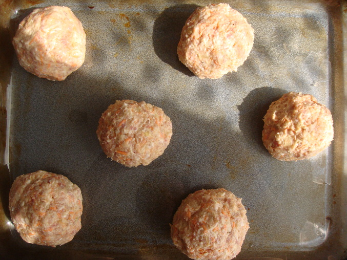 Вбить яйцо, посолить и поперчить. Хорошо вымесить и отбить фарш. Сформировать шарики и разложить их на противне: