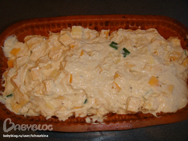 Для теста в разведенную старую сметану добавила травки, розовый перец, соль, сахар, пару яиц, пакетик дрожжей, муку и замесила жидкое тесто: