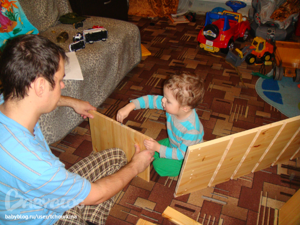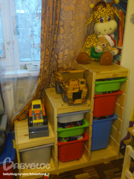 Немного о подарках. Доча с зятем начали превращать подаренные на НГ деньги в реальные подарки. На денежки дедушки Миши купили в Икеа Вове стеллаж для игрушек. Вова, конечно же, помогал собирать: