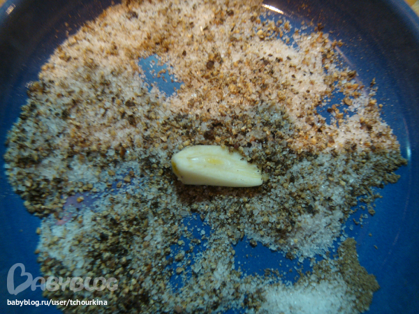 Смешать в блюдце свежемолотый черный перец и крупную соль. Обмакнуть зубок чеснока и вложить его в прокол в мясе.