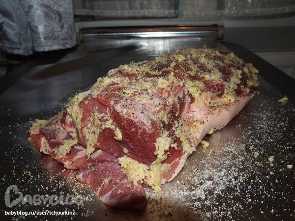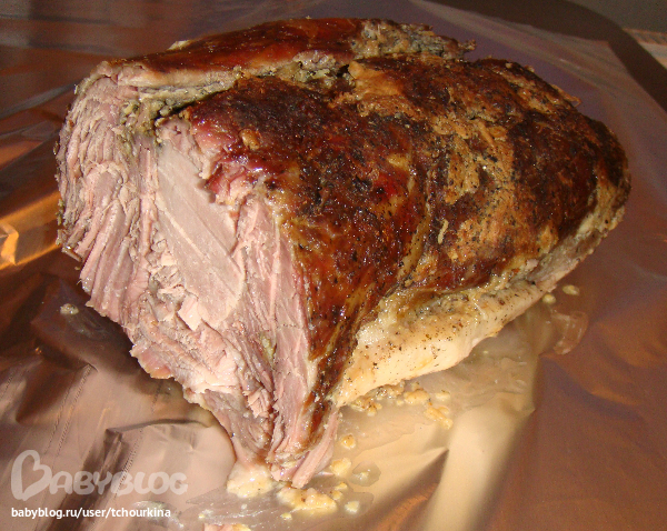 Сверху весь кусок посолить, поперчить, натереть чесноком. Завернуть в фольгу и запекать в духовке (1 час на каждый килограмм):