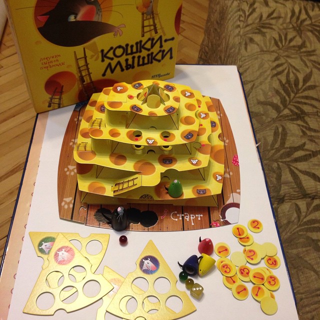 Честно скажу, пока я собрала сырную пирамиду чуть с ума не сошла, готова была занести эту игру в антисписок, но когда стали играть сразу же позабыла об этих трудностях сборки. Игра очень динамичная, веселая. Степке понравилось очень, хотя не могу сказать что он любитель настольных игр. Смысл игр- первым добраться до вершины и набрать наибольшее количество очков. Но на пути мышек встречается и кошка и ловушки, так что дойти до верху оказывается не просто, а если учесть тот факт, что каждая мышка еще и несет в себе маленький стеклянный шарик, который не должен падать и его можно придерживать только одним пальчиком, то задача для малышей не из легких. Игра-ходилка. Бросаешь кубик, считаешь ходы, тренируешь счет в общем игра отличная 8 баллов из 10. Мне только не понравилось собирать пирамиду, но возможно не у всех это вызовет трудности. Игра от 5 лет, количество игроков 2-4.