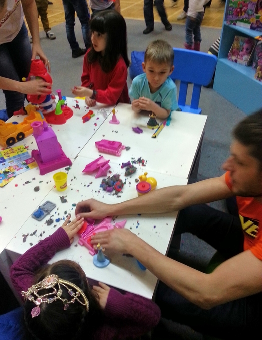 Потом мы побывали в мотессори центре, полепили, поиграли с жуткой механической игрушкой под названием ферби ))