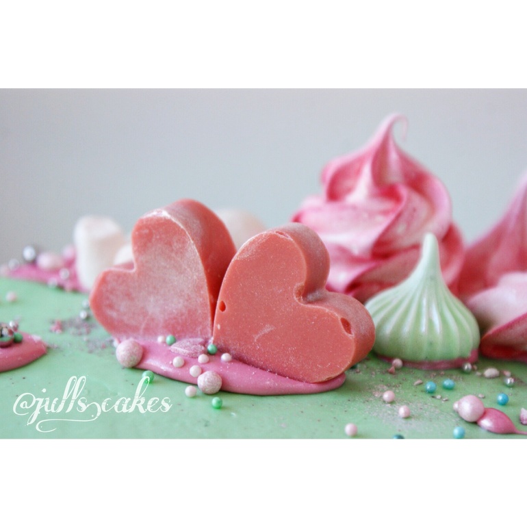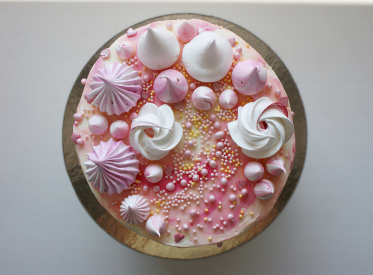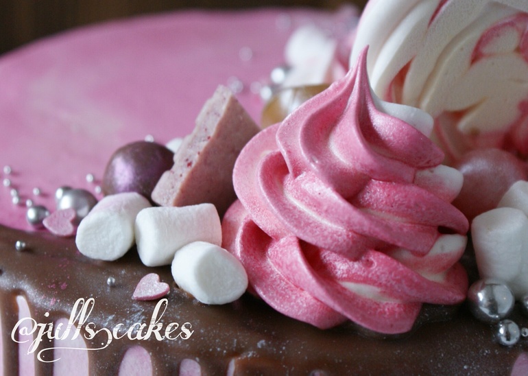 Внутри ванильный бисквит, сливочный крем, малиновый и клубничный кули, ганаш на белом бельгийском шоколаде с кокосовым кранчем. В декоре безе, сахарный бисер, конфеты, шоколад