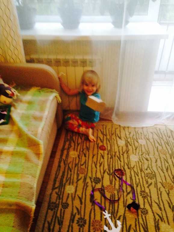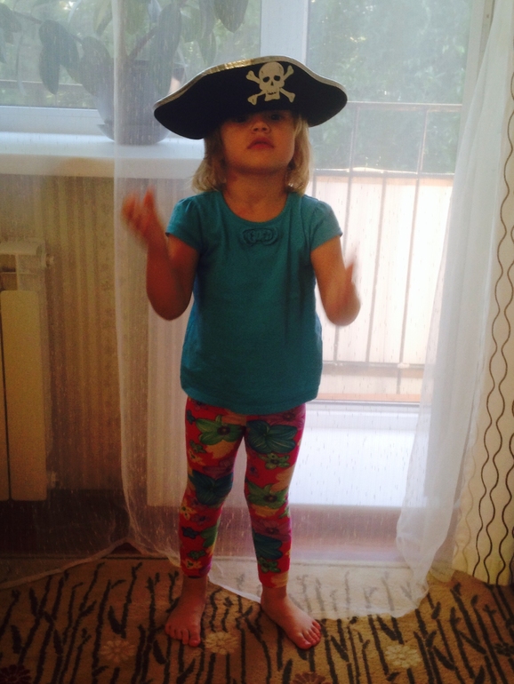 Я спрятала сундук с сокровищами в квартире, написала письмо от пирата Джека воробья, нарисовала карту и разделила ее на 4 части. За каждый блок заданий капитан Марипундель получала один кусочек карты. Письмо прочитали, шляпу одели и начали играть.