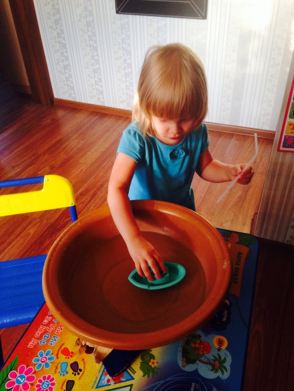 Следующее испытание - "Черная Жемчужина". ( Занятие проводилось уже под вечер-поэтому я решила уже взять готовый пластмассовый кораблик и просто подуть на него через соломинку.)