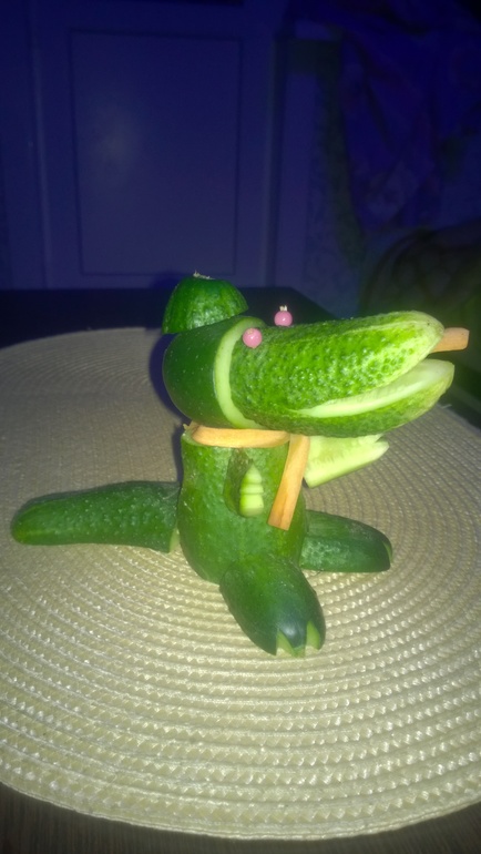 И вот сегодня в садике у дочи праздник "Дары осени". Наш папа с помощью Лизы, конечно, и всемогущего интернета смастерил вот такого крокодильчика)). Наша осень богата своими плодами, все собирают урожай, и... у нас еще есть свежие огурцы.![]()