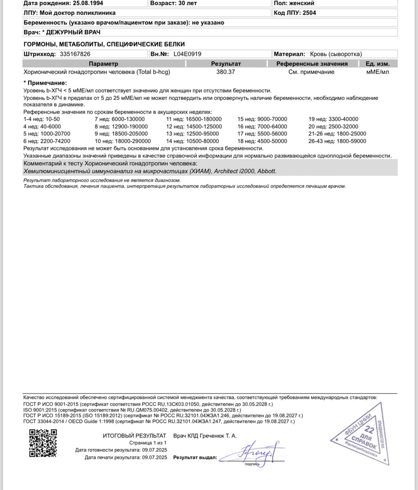 ХГЧ за 1 день до задержки