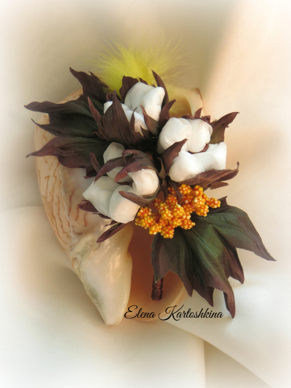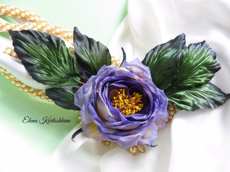Она из шелкового крепдешина, большие в натуральную величину листья из японского блестящего сатина. Всю эту пушистую красоту можно использовать не только как брошь, шпилькой к примеру закрепить в прическе за листики.