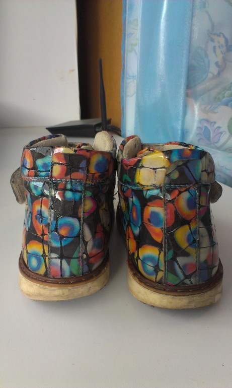 Лаковые ботиночки на тонком флисе. Стелька 16.5 см. Мысы чуть потерты, но на фоне рисунка не очень заметно. Коллекция этого года, носили одну весну. Стоили около 3000.Продам за 800р.Подошва потерта см. фото.