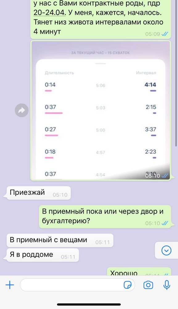 Так-так. Ну что, вот оно, начинается. Интересно) Чувства, в которые меня погрузило начавшееся событие, можно описать как Волнительная готовность. Это был этап, на котором я ещё могла мобилизоваться и вжжжжух - вот передо мной приложуха счетчик схваток, вот тут я уже применяю советы по дыханию и стою в асане, виляя попой, как учили много месяцев на йоге. На часах три ночи. Конечно, рано ехать в роддом, и не хочется никого будить! Прикинь, я даже решила не сразу написать своему врачу, с которой заключен контракт, а посмотрела, когда она была в сети - мало ли она спит...))) Приложение схваток светит ночником на темной кухне, моя кошка пришла и легла смотреть на меня. А схватки (как круто было оперировать такими словами в СВОЕЙ беременности) тем временем стали частыми.