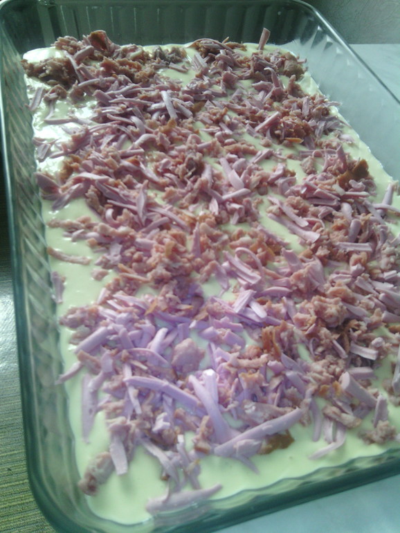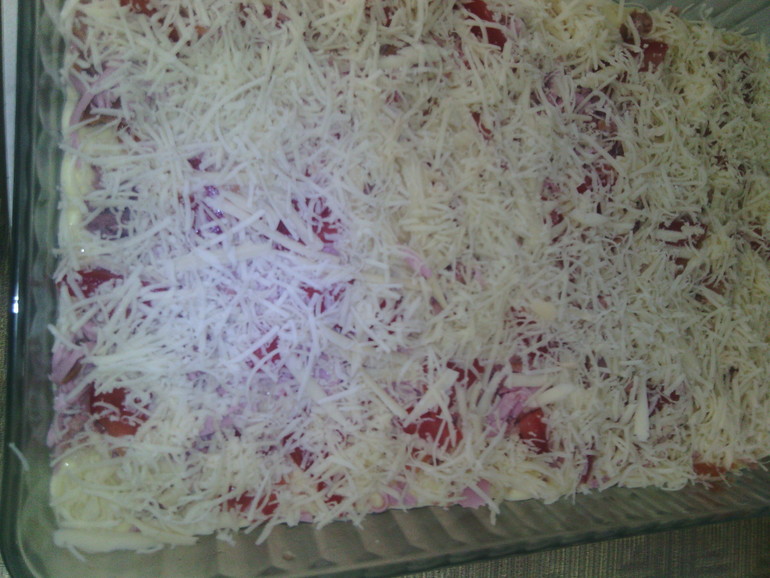2 яйца+ 3 ст.л.майонеза+3 ст.л. муки перемешать, получится жидкое тесто.