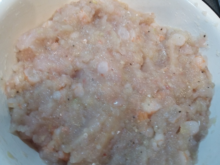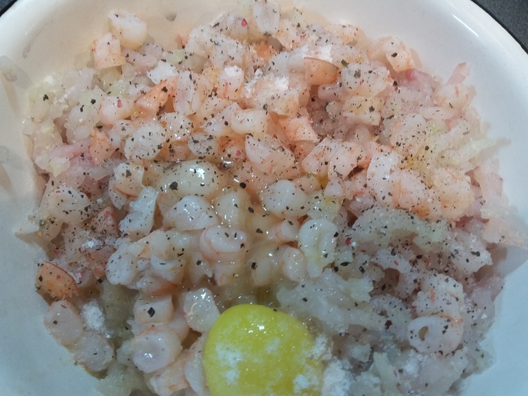 Добавить в фарш креветки, яйцо, соль, черный перец: