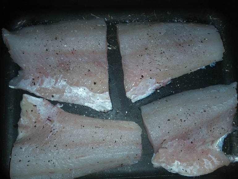 Разрезать на порционные куски, разложить в форме, посолить и поперчить: