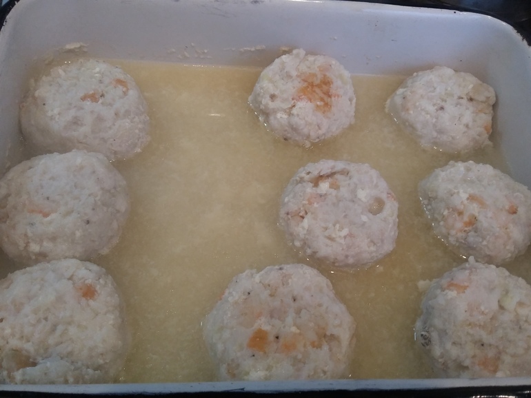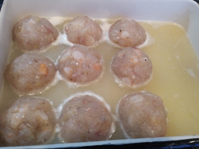 Сформировать тефтели. Положить в форму. Залить бульоном: