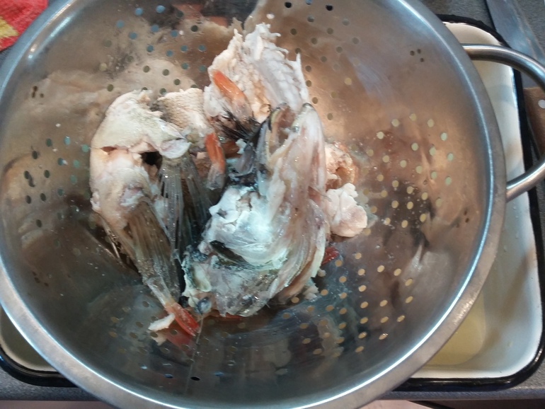 Голову, хвост, кости, кожу залить холодной водой и поставить варить: