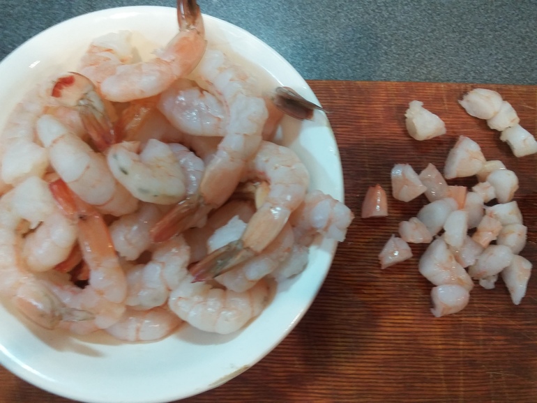 Нарезать королевские креветки (можно использовать целиковые маленькие креветки):