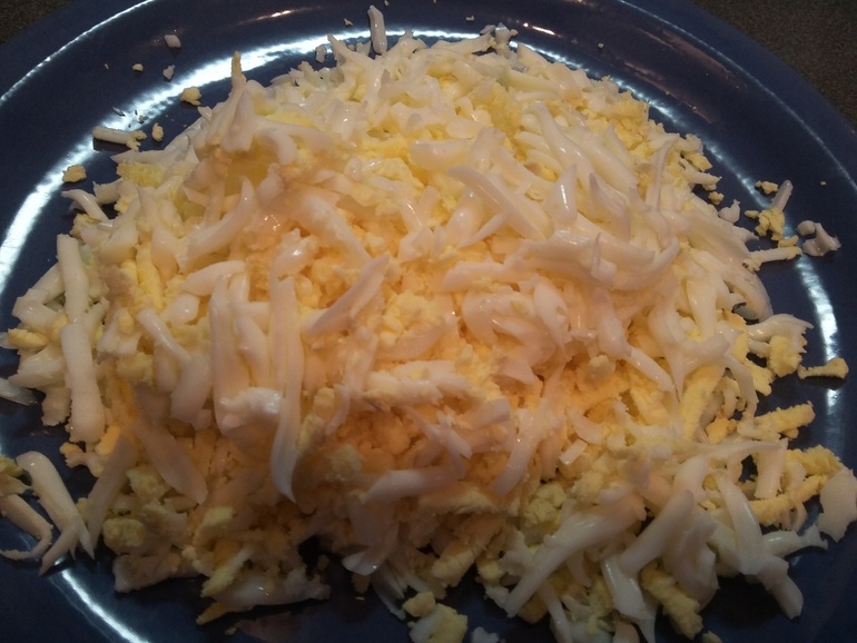 Натереть на крупной терке 3 яйца: