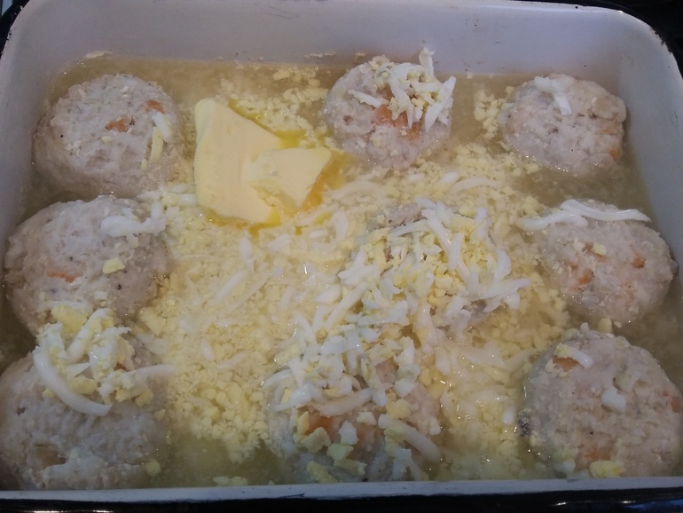 Тефтели перевернуть, засыпать яйцами, положить 100 г сл.масла: