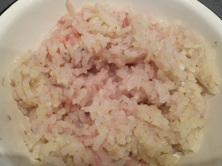Рыбу смолоть, добавить лук: