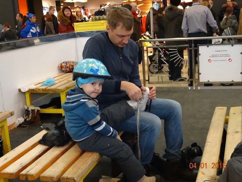 Матюша первый раз в своей жизни встал на коньки. Я была зрителем и фото-видио оператором, а мои любимые мужчины катались))) Мы с Вовой думали его хватит минут на 15-20, но "прокатался" целый час. Был такой восторг! сначала просто учился шагать на коньках и стоять, к концу получалось лучше, но будем тренироваться дальше)))
