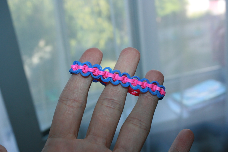 На рогатку одеваешь восьмерку, потом обычную, нижние снимаешь поверх верхних, и далее всегда одеваешь восьмерки и также снимаешь через верхние.