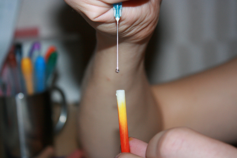 Открываем фломастер. Переворачиваем его, Стучим по столу и достаем стержень. Капаем из шприца 20 капель воды (в маленькие меньше). Закрываем. Ждём результата.